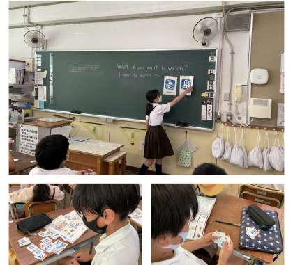 外国語では、「What do you want to watch?」の学習をしています。今日は、友達の見たいスポーツを予想する「予想当てゲーム」に取り組みました。「○○さんは、最近バスケットボールにはまってるから見たいんじゃないかな」や「○○さんは、絶対これ見たいはず!」と予想していました。予想が当たると「イエーイ!」と喜び、外れると「えーっ!」と驚いていて、反応がとても面白かったです!