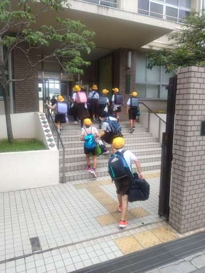 登校風景です。 5年生は大きな荷物を持って登校です。