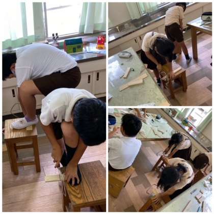 今日の図画工作科では、のこぎりを使って木の板を切りました。最初は難しかったようですが、もう3回目ということもあり、だんだん上手になってきました。木を押さえながら、木を切る動作に力がいるようで、汗をかきながらがんばっていました。次は、切った木をくぎでつないでいく作業に入っていきます。