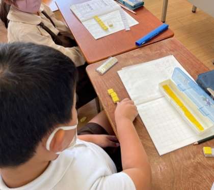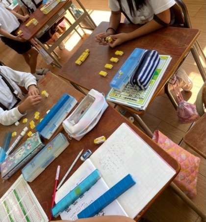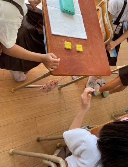 2年生は算数でかけ算を勉強しています。今日はブロックを使って、かけ算の式をあらわしました。友だちと教え合ったり、問題を出し合ったりして、楽しく学習しています♪