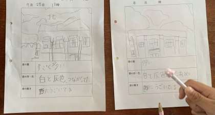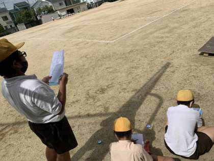 理科の学習で、雲の観察をしました。天気はくもりでしたが、雲の間に見える青空を見つけて、その部分をスケッチしていました。じっと空を見ていると、西の方に動いていることに気が付いたようです。ほかにも、たくさんの気付きを観察カードに書くことができました。
