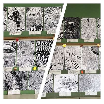 図工の時間に描いていた「線画アート」が完成しました!「ゆっくり・はっきり・一度きり」を意識して線や模様を描き、自分の世界を表現することができました!タイトルを考えている時には、「海の中の世界みたい」「ここらへんが森に見えてくる」など、思い思いの世界を広げる姿が見られました。細かいところまで丁寧に仕上げていて、素敵な作品ばかりです★