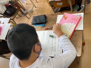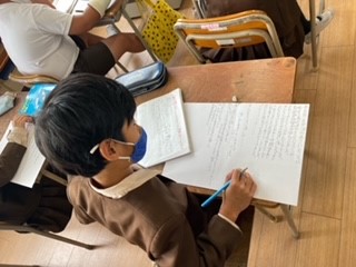 4年生の国語の学習では、教科書の絵を参考にしながら山場のある物語をかいています。今までに学習した「一つの花」「走れ」の物語を振り返り、山場ではどのようなことが起こるか想像してかき進めています。登場人物の会話や性格を物語にするのは難しいようですが、国語の時間にはいい作品を作ろうとみんな一生懸命です。完成が楽しみです(^^)