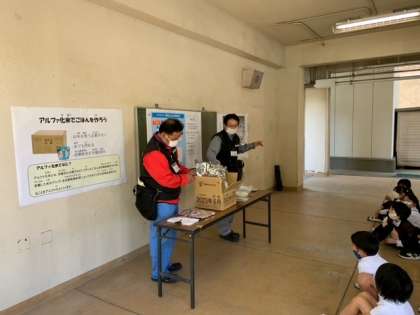 その後は、アルファ化米について説明してもらい、給食の時間に試食会をおこないました。想像以上の味だったようです!また、お家でも感想を聞いてみてください。