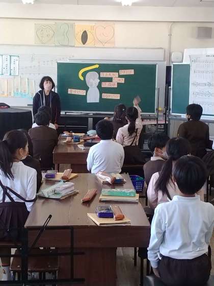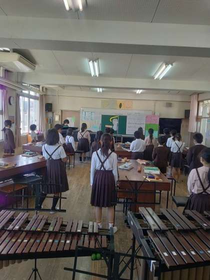 音楽の研究授業です。1時間のなかで合唱、合奏をおこないます。