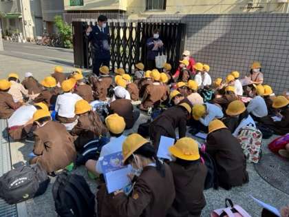 3年生は昨日、社会見学で西成消防署へ行ってきました。消防署の中を見学したり、消防車にのっている火を消す道具を持ったりしました。