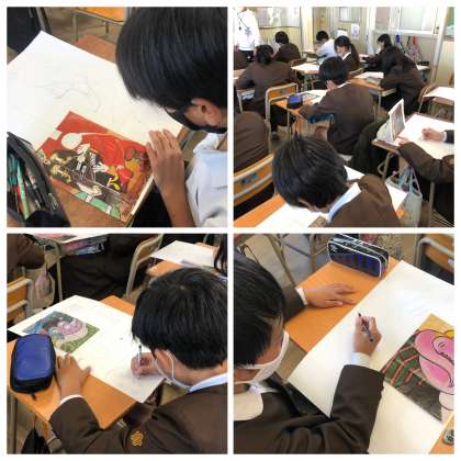 6年生では、展覧会に向けて、ピカソの絵を模写しています。絵を描く前に、ピカソがどんな人なのか、どんな作品を描いているのかを調べました。その中で、「模写してみたい!」という作品を一つ選び、描き進めています!