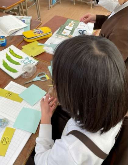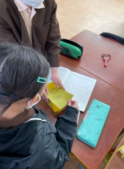 「同じ形の面がいくつかあるね。」「さいころの箱は面がみんな正方形だね。」と言いながら、面の特徴を見つけることができました。話し合いながら学習を進めることができています。