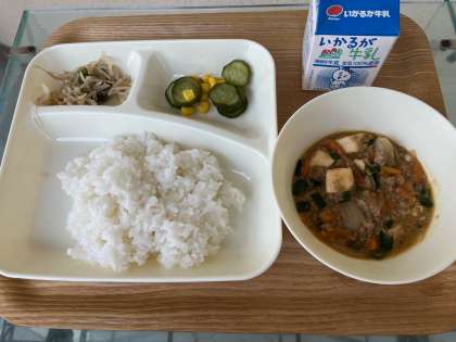 給食室では、朝から美味しい匂いが漂っていました。今日の献立のマーボーどうふは、牛ひき肉、豚ひき肉、とうふ、たまねぎ、にんじん、にら、しょうが、にんにくが入った、具沢山で彩りのいい、とてもおいしい一品でした。