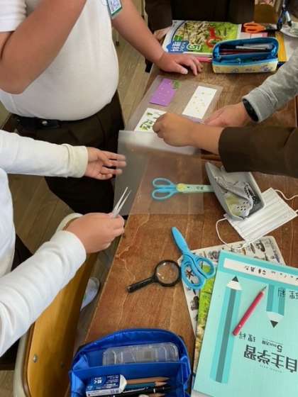 5年生の理科では、アブラナの花のつくりの学習をしています。ピンセットや虫眼鏡を使って、花びらやめしべを観察しました。