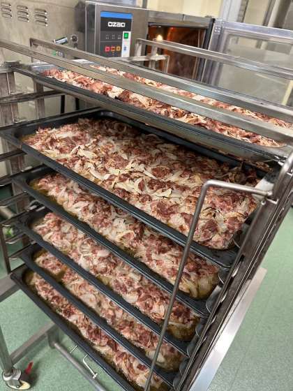 今日の献立の豚肉のガーリック焼きは、ワイン、塩、こしょう、ガーリック、こいくちしょうゆ、オリーブ油で下味をつけた豚肉に、たまねぎを混ぜ合わせ、焼物機で焼いています。食欲をそそる香りがたまらない一品でした。