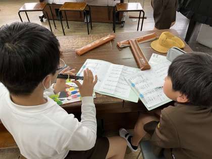 授業の後半には、二人一組でリコーダー練習をしました。ファ#や高音がきれいに出せるように、運指や息の強さをお互いに確認し合いながら取り組みました。