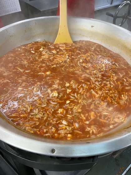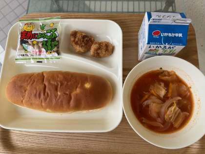 今日の献立のミネストローネは、鶏肉、キャベツ、たまねぎ、トマト缶、にんじん、にんにく、パセリが入った、トマト味のスープです。にんにくとオリーブ油の香りが食欲をそそる、おいしい一品でした。