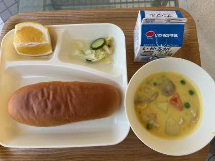 今日の献立のコーンクリームシチューは、鶏肉、じゃがいも、コーンペースト、たまねぎ、にんじん、コーン、グリンピース、マッシュルームが入った、具沢山のクリームシチューです。素材の旨みと牛乳、バターがとてもよく合ったとてもおいしい一品でした。