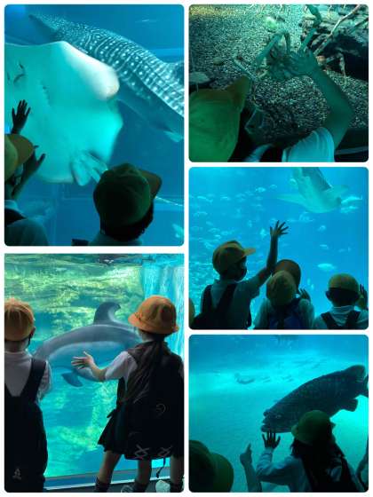 大きなジンベイザメやペンギンのえさやりなど、間近で見た海の生き物たちに、みんな夢中です。