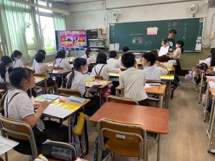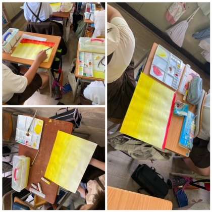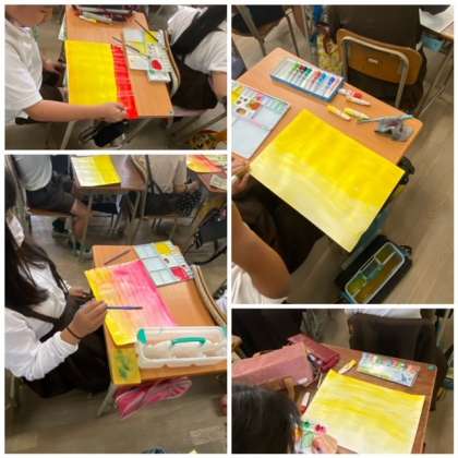 今日は、まず夕やけの空を描きました。赤と黄色で絵具と水の量を調節し、グラデーションを作っていきます。