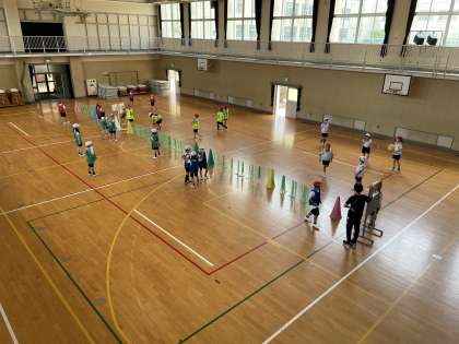子どもたちは、2人組になってボールの受け渡しをしたり、グループで片手のボールキャッチやバウンドパスをしたりとたくさん練習してきました。