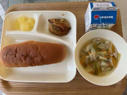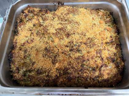 今日の献立のカレードリアは、ワインで下味をつけた鶏肉とたまねぎを炒め、グリンピース、米と合わせて煮、カレールウの素、クリーム、塩、こしょうなどで味付けをしミニバットに入れて、混ぜ合わせた粉末チーズとパン粉をふりかけてオーブンで焼いています。とても手間をかけている分、おいしさは格別です。