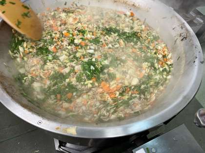 今日の献立の中華煮は、豚肉、キャベツ、たまねぎ、たけのこ、にんじん、にらが入った中華風の煮ものです。たくさんの素材の味が感じられる、とてもおいしい一品でした。