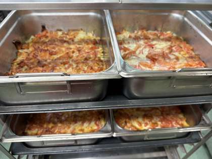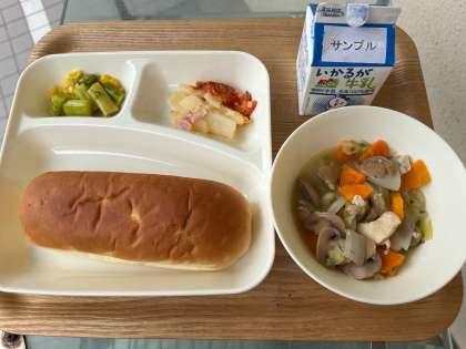 今日の献立のじゃがいもとトマトのチーズ焼きは、生のトマトを使用しています。ベーコンとじゃがいもに下味をつけ、トマトと一緒にミニバットに入れ、チーズをのせて焼物機で焼いています。焼いたチーズが香ばしく、おいしい一品でした。