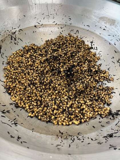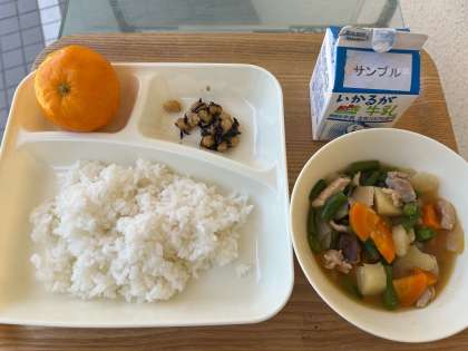 今日の献立のひじき豆は、もどした大豆にでんぷんをまぶしてなたね油で揚げ、ひじきが入った甘辛い調味液をからませています。食べやすく、とてもおいしい一品でした。