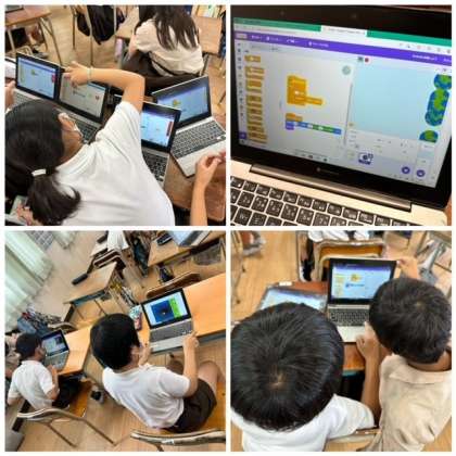 総合的な学習の時間にプログラミングに取り組んでいます。スクラッチというアプリを使って、キャラクターに動きをつける学習です。初めのころは単純な動きだけでしたが、最近では、音楽を付けたり、シューティングゲームを作ったりしています^^
