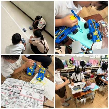 理科の「電気のはたらき」では、学習のまとめとして車を作っています。うまく電流の流れができていないと車は動きません。やっと動いたと思ったら、反対に動き出す子も…^^;