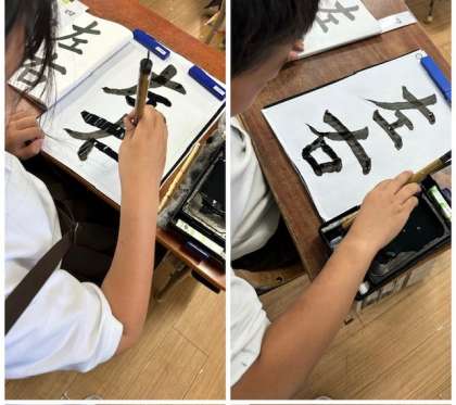 書写(習字)では二文字に挑戦中です。これまでの習字は一文字だったので、バランスも大事になってきます。そして、今回の学習のめあてでもある「横画と左はらいの画の長さ」にも注意です!