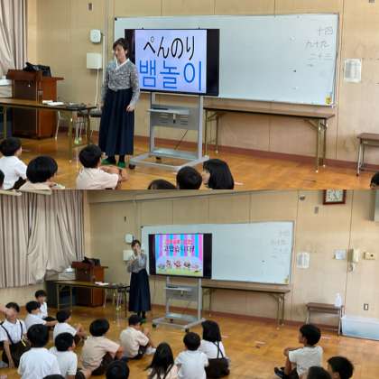 子どもたちは、ソンセンニムに「自己紹介」「数字」「ペンノリ」を教えもらいました。実際に、韓国語で自己紹介をしたり1〜10までの数字を話したりしました。子どもたちは「日本語とにている韓国語がある!」「今度、図書で韓国の本を借りてみる」など、楽しそうに活動に取り組んでいました。