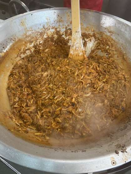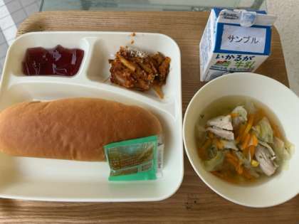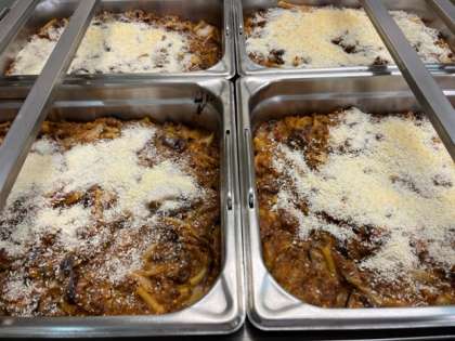 今日の献立のなすのミートグラタンは、旬のなすと牛ひき肉、豚ひき肉、マカロニ、たまねぎ、にんにくを回転釜で炒め、ケチャップやソースで味付けをしています。それをミニバットに入れて、パン粉をふりかけてから焼物機で焼いています。とてもおいしい一品でした。