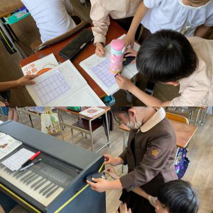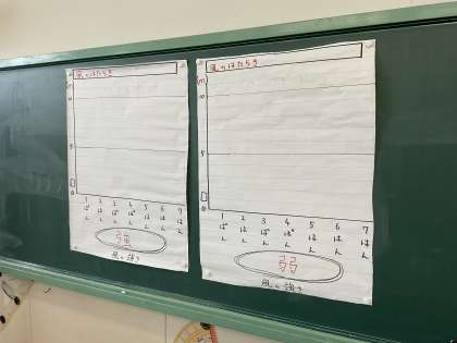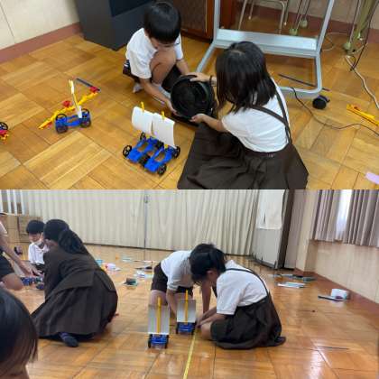 送風機の風の強弱で、ものがどれくらいの距離を進んだかを記録していきます。その際、算数科で学習したまきじゃくを使って「いどうしたきょりの長さ」をはかっていきます。そして、それらの記録をグループで「ぼうグラフ」を使って表していき、風のはたらきをくわしく学習していきます!