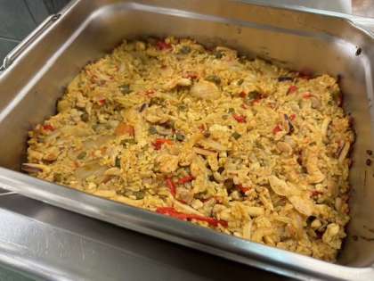今日の献立のパエリアは、鶏肉、いか、たまねぎ、赤ピーマン、トマト(缶)、さんどまめ、にんにくが入っています。回転釜で炒めた後、ミニバットに入れて焼物機で焼いています。素材の旨味が合わさって、とてもおいしい一品でした。