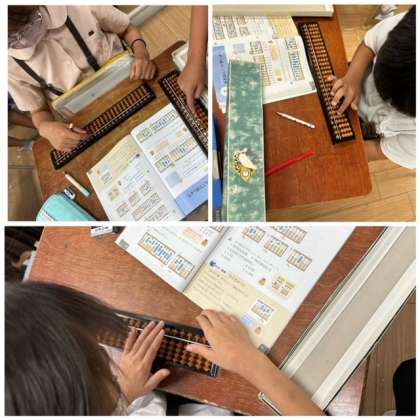 4年生の算数科では、そろばんに挑戦しています。最初に3年生の学習を復習してから、大きい数を読んだり、表したりしました。簡単な操作なので、みんなすぐにできていました^^