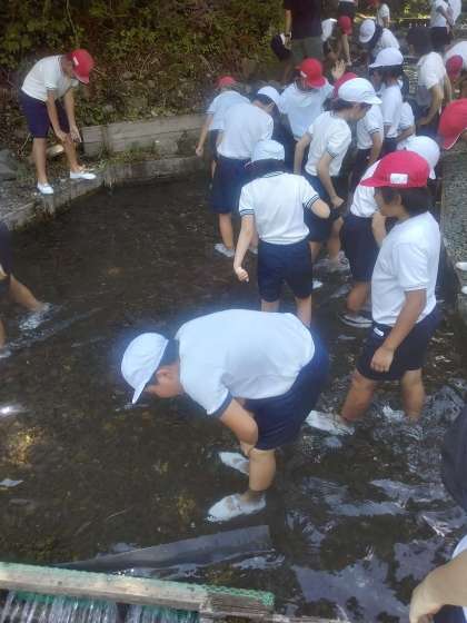 魚つかみが始まりました。水の冷たさにびっくりしています。