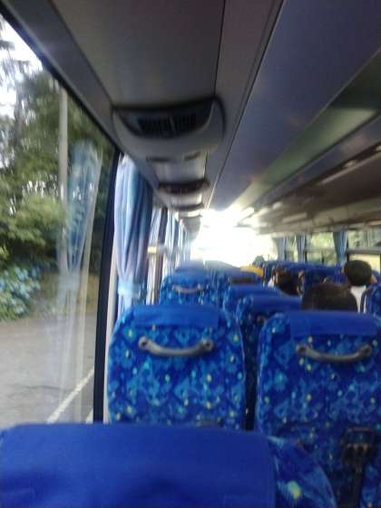 予定より30分早く宿舎を出発しました。カメラマンさんと宿舎の方が見送る中、バスは大阪に向かいます。