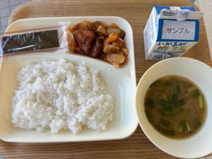 今日の献立の酢豚は、たまねぎ、たけのこ、にんじん、ピーマンを炒めて甘酢で味付けし、下味をつけてでんぷんをまぶし、からりと揚げた豚肉を加えています。とてもおいしい一品でした。