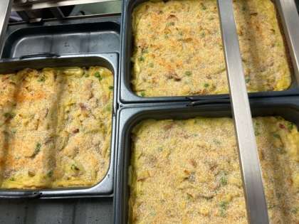 今日の献立の豆乳マカロニグラタン[米粉]は、乳製品や小麦粉を使用していないグラタンです。豆乳特有の匂いを軽減して旨みを増すために、カレー粉やチキンブイヨンを使っています。優しい味わいの、とてもおいしい一品でした。