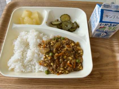 今日の献立の大豆入りキーマカレーライス[米粉]は、小麦アレルギーの人でも食べられるように米粉のカレールウの素を使用しています。牛ひき肉、豚ひき肉、新食材の豚レバーチップ、ひきわり大豆、たまねぎ、にんじん、グリンピース、にんにくが入った、とても具沢山のキーマカレーです。とてもおいしい一品でした。