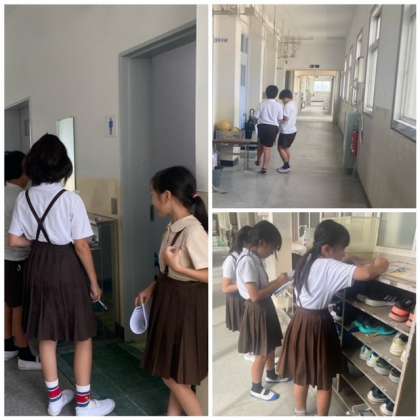 校舎内を探検し整理がされている場所、されていない場所を見つけに行きました。「3年生や4年生の靴箱が整理されていたよ。」「トイレのスリッパもきれいに並べられていたね。」と色々な発見がありました!