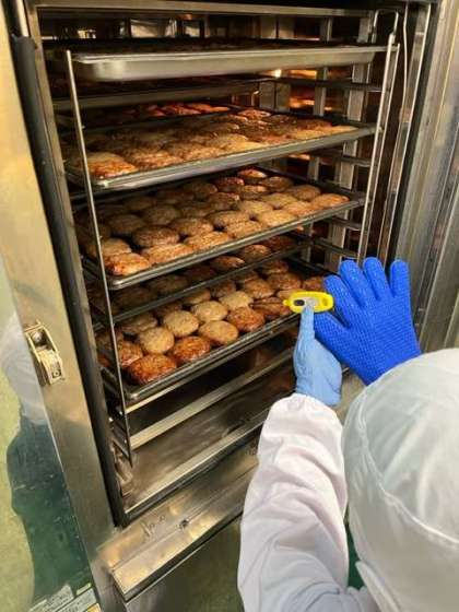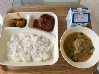 今日の献立の和風ハンバーグは、焼物機で焼いたハンバーグに、砂糖、みりん、こいくちしょうゆを合わせて煮、でんぷんでとろみをつけたタレをハンバーグにかけています。ごはんによく合うおいしい一品でした。