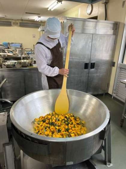 かぼちゃのいとこ煮は、だしで煮上げたかぼちゃを砂糖、みりん、うすくちしょうゆで味付けし、ドライパックの小豆を加えて煮ています。こちらもとてもおいしい一品でした。