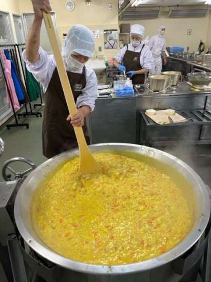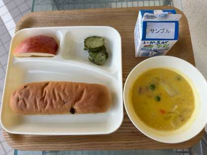 今日の献立の豆乳コーンクリームシチューは、小麦アレルギーのある人も食べることができるように、上新粉でとろみをつけています。また、乳アレルギーのある人も食べることができるように、豆乳を使用しています。具沢山で、とてもおいしい一品でした。