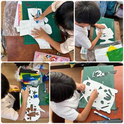 子どもたちは、好きな色のセロファン紙を貼り、自分のイメージしたものを楽しそうに表現しています♪