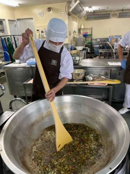 今日の献立のもずくと豚ひき肉のジューシーは、もずく、豚ひき肉、こんぶ、にんじん、むきえだまめが入っています。豚骨スープで旨みを増しています。ジューシーとは、沖縄の郷土料理で炊き込みご飯や雑炊のことをいいます。今日の献立のジューシーはご飯にとてもよく合い、とてもおいしい一品でした。