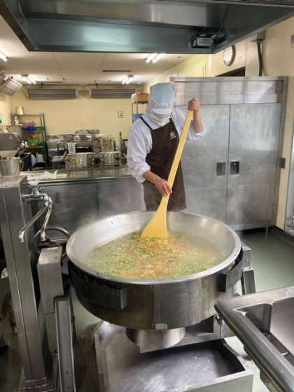 さつまいものみそ汁は、煮干しでだしをとっています。鶏肉、さつまいも、はくさい、たまねぎ、青ねぎが入っています。さつまいもの甘さが感じられる、こちらもとてもおいしい一品でした。