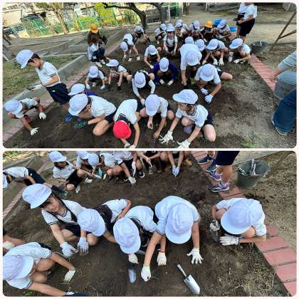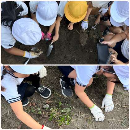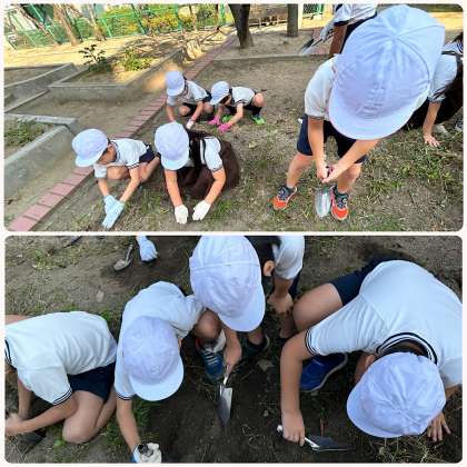 2年生の生活科でさつまいもを育てています。毎日水やりをして、夏から育てていたさつまいもがついに収穫の時期になりました!