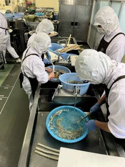 今日の献立のいわしのつみれ汁は、ゆでた後にしょうが汁、料理酒で下味をつけたいわしだんごと、だいこん、ごぼう、にんじん、みつばが入った具沢山の汁ものです。たくさんのごぼうも、給食室でささがきにしてから使用しています。しょうがの風味がいわしだんごのくさみを消していて、とても食べやすくおいしい一品でした。