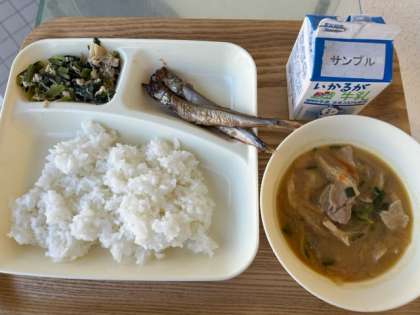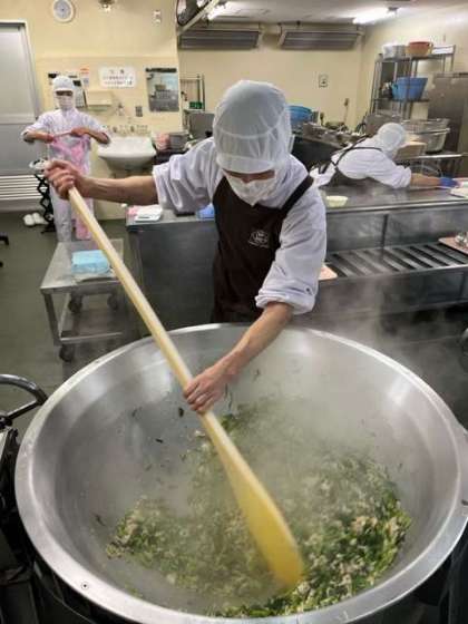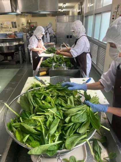 今日の献立のこまつなのいためものは、ささみ(油漬け)、こまつな、まいたけを使用しています。こまつなは汚れがなくなるまで何度も洗ってから使用します。切る時も一枚一枚確認をしながら切っています。砂糖としょうゆであじつけをしていて、とても食べやすくおいしい一品でした。