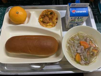 今日の献立の豚肉と野菜のスープ煮は、豚肉、じゃがいも、たまねぎ、キャベツ、にんじん、グリンピース、マッシュルームが入った洋風の煮ものです。具沢山でたくさんの旨みが合わさった、優しい味のとてもおいしい一品でした。
