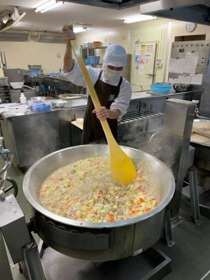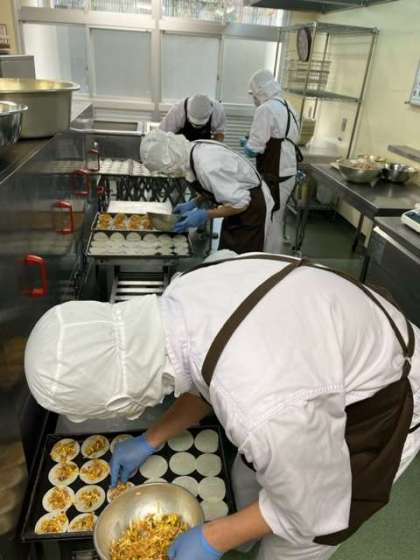 変わりピザは、ツナ、コーン、ピーマン、ピザソース、チーズを混ぜ合わせて、ぎょうざの皮にのせ、焼物機で焼いています。ほとんどのクラスで完食でした!こちらもとてもおいしい一品でした。
